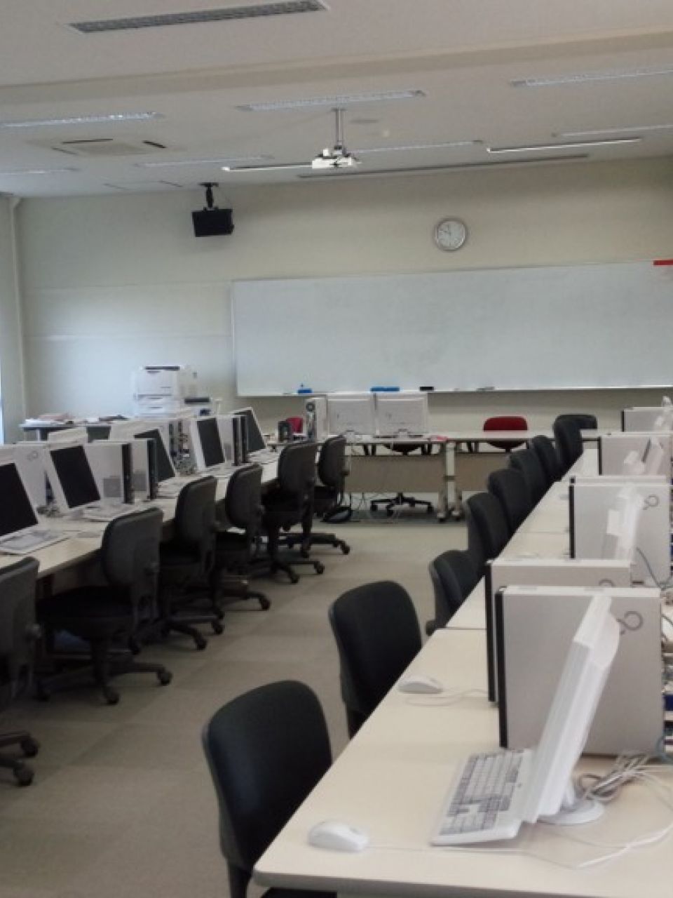 総合情報教育棟の3階にはコンピュータ室があります。約40台のパソコンが設置されており、通常授業はもちろんのこと、総合人間科の調べ学習などにも活用されています。